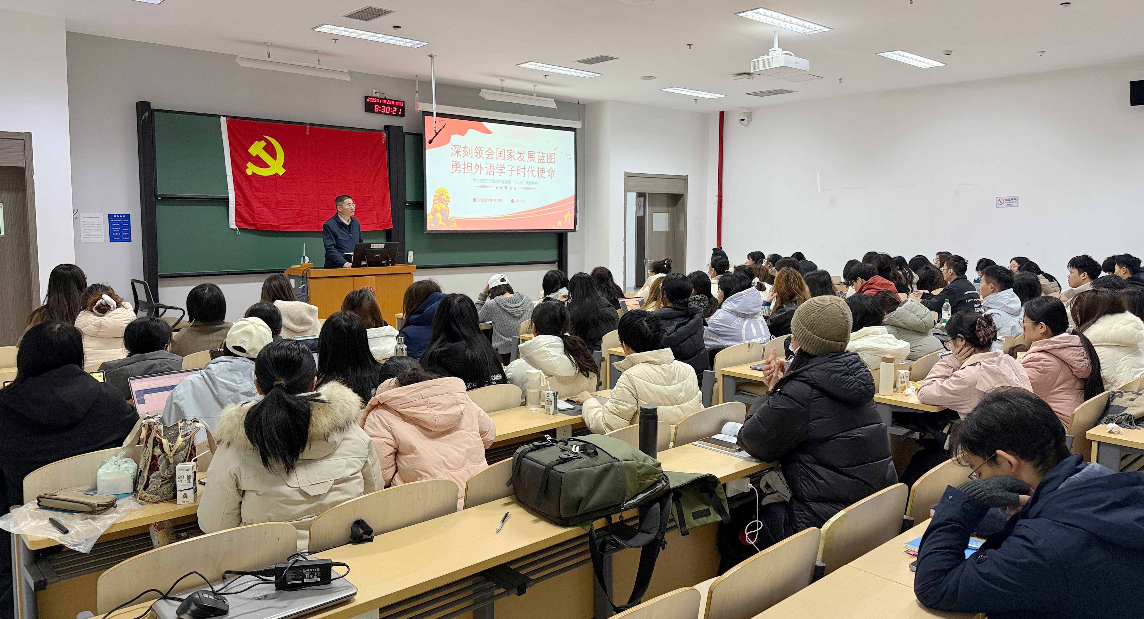供稿、摄影:卞广为 编辑:于洁莹 为深入学习贯彻党的二十届四中全会精神,不断提高学生党员和入党积极分子的政治素养和思想理论水平,11月26日,外国语学院院长李京廉教授以“深刻领会国家发展蓝图,勇担外语学子时代使命——学习党的二十届四中全会和‘十五五’规划精神”为题讲授专题党课。学院全体学生党员和入党积极分子、明德书院昭理和知理党支部成员参加党课学习。 李京廉从“时代方位与战略擘画——规划的宏大背景与深远意义”、“核心要义与外语机遇——规划的主要内容”、“知行合一与时代同行——青年学生...