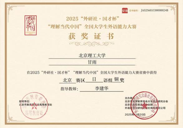 近日,2025“外研社·国才杯”“理解当代中国”全国大学生外语能力大赛(日语组)圆满落幕。经过校赛、省赛、国赛层层高强度比拼,我校日语系选手在李建华、吉田阳介老师的指导下,捷报频传,展现了过硬的专业实力与良好的综合素养!其中,刘然同学在北京市赛中斩获金奖,并凭借出色表现晋级国赛,最终摘得国赛铜奖;赵思瑞同学荣获北京市赛银奖;甘雨、曾翊航两位同学也在北京市赛中取得铜奖的优异成绩。